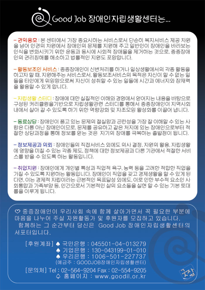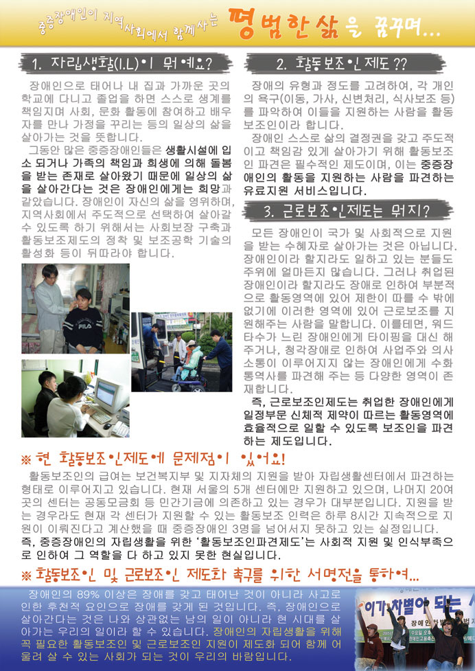 ㅎㅎ 저는 사회 복지과 전공이 아닌데도 일단은 중증 장애인 자립생활 팀장을 맡아서 눈물나는 투잡을 하고 있습니다.