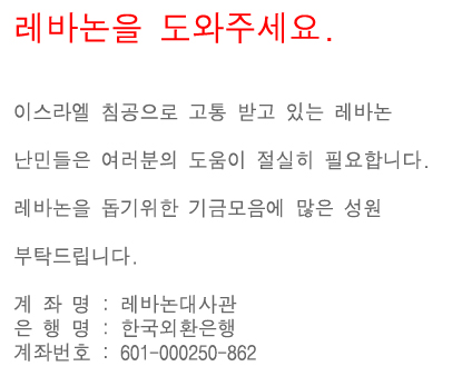 성금 보낼 곳 : 주한레바논대사관 (아래를 클릭하면 팝업창에 계좌번호가 나옵니다)