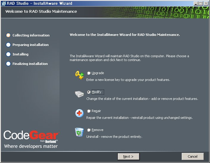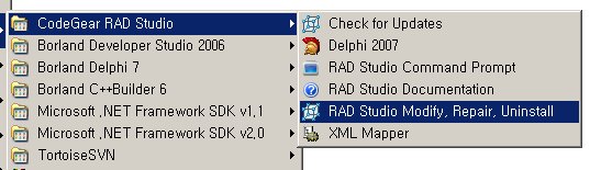 먼저, 첨부한 첫번째 그림처럼, 프로그램 그룹에서 "RAD Studio Modify, Repair, Uninstall" 아이콘을 선택합니다. 그러면 인스톨어웨어 설치프로그램이 나타나고, 여기서 인스톨 수정/제거 등이 가능한데요.