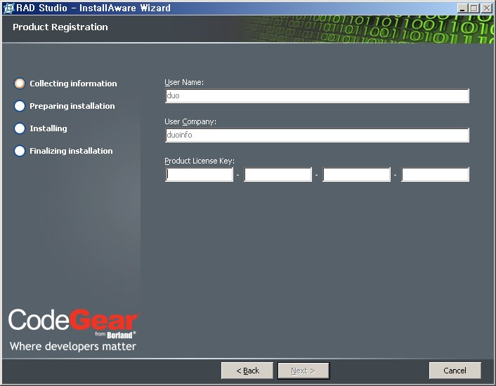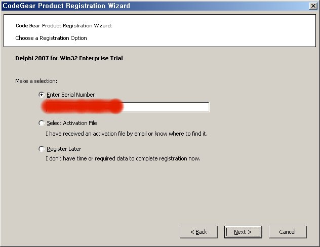 이제 델파이 2007을 실행시켜보면, 중간에 델파이나 C++빌더 개발자들에게 익숙한 Registration Wizard가 뜨면서 아까 입력했던 시리얼넘버가 나오고 등록 절차를 시작하게 됩니다. 그냥 엔터 엔터.. bdn 계정 넣고 또 엔터..