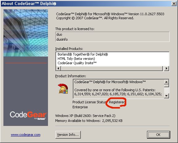 이제 델파이 2007이 정품 모드로 뜹니다. 마지막 그림을 보시면 어바웃 박스에 Product License Status 부분에 이전에 Trial이었던가로 나왔던 것이 Registered로 바뀐 것을 알 수 있습니다.