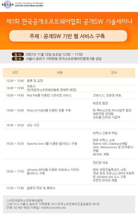 세미나 내용 : Red Five를 이용한 스트리밍 서비스, Ruby on Rails, Apache Axis2, UEngine BPM 등