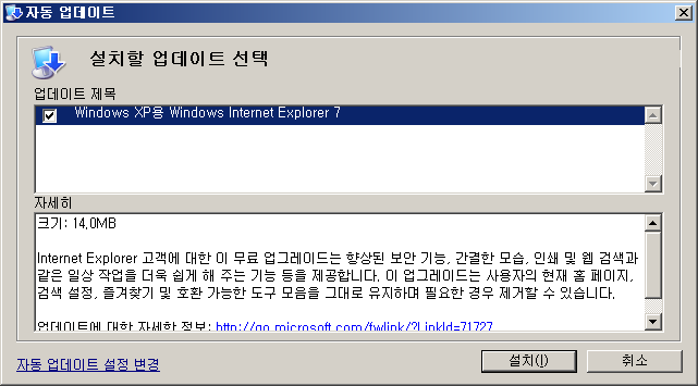 만약 자동 업데이트 옵션 설정도 못 할 정도의 초급 유저라면 MS에서 하라는대로 하는게 낫죠. 바이러스 및 악성코드이 숙주머신이 되어서 네트워크를 오염시키게 될 가능성이 높은 유저들이니까요. IE 7이건 뭐건 다른 건 다 그렇다 치고서라도 우리나라의 홈페이지들의 active-x 의존도는 좀 낮춰야 한다고 봅니다. 여기 계신 분들은 대부분 프로그래머라서 이 말에는 공감을 하겠지만, 일정 맞추려면 active-x를 안 쓸 수 없게 되는 현실이 가슴 아프시리라 믿습니다;;; 저도 active-x로 바탕화면에 바로가기 만들고 하는 사이트들을 경멸 했는데, 사장님이 그런 기능을 요구하니 -_-;;; 어쩔 수 없이 하게 되더라고요. 배째라고 할 수도 없고...쩝.... 그렇다고 그 기능을 다르게 구현할 방법을 찾으려니 일정이 그렇게 한가하지도 않고... ㅡㅡ; 그냥 공개되어 있는 소스 찾아서 샤샤샥 하는 수 밖엔 없는게 현실이라 안타깝네요. 이런 악순환이 계속 될거 같아서 더 안타깝습니다.;;;;; 관련 글 리스트