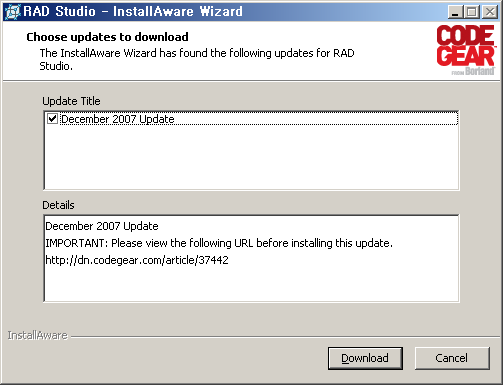 제대로 업데이트된 거 맞네요. 아직 이번 업데이트를 설치하지 않은 분들께 주의점 하나... 이번 12월 업데이트를 설치하기 전에 반드시 이전의 업데이트3까지가 다 설치되어 있어야 합니다. 업데이트3 설치후 빌드넘버는 11.0.2804.로 시작합니다. 반드시 이 버전인지 확인하고 이번 12월 업데이트를 설치하세요. http://dn.codegear.com/article/37442 관련 글 리스트