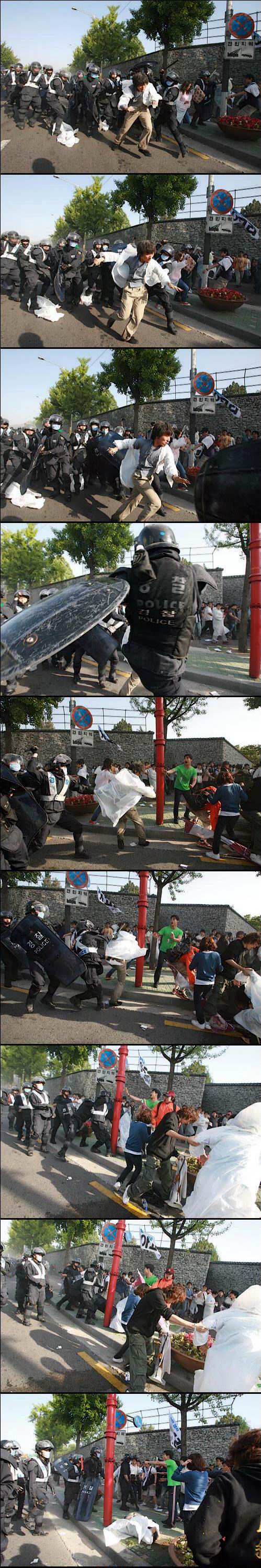 촛불든 시민들에게 물대포를 퍼붓고, 경찰특공대까지 투입하다니... http://bloggernews.media.daum.net/news/1246281 경찰이 여자를 넘어뜨린 다음, 축구공 다루듯이 밟고 찬 행위는 분명히 잘못된 것입니다. 또 카메라 앞에서 약올리는 시민을 방패로 찍어버리는 행위 역시 잘못된 것입니다. (아마 카메라 없었으면 훨씬 더 많이 때렸을 것 같은데, 그래도 역시 잘못된 행위입니다.)