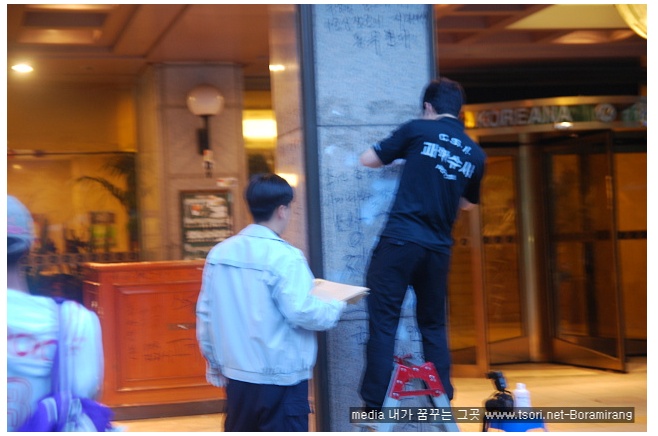 어제 저녁 이곳을 지나던 시민들이 조선의 왜곡보도에 항의하여