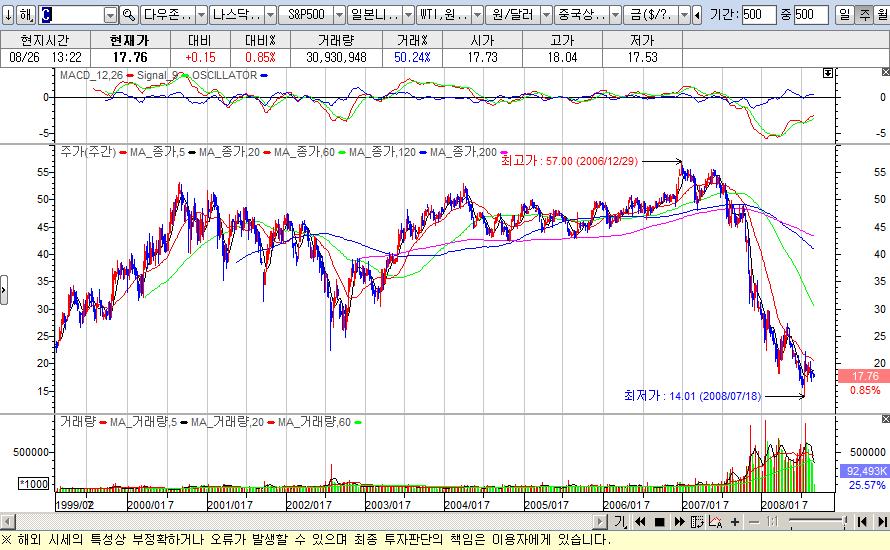 그 대표적인 존재가 역시 시티 그룹인데, 한 때 꿈의 주가인 60 달러를 돌파하려다가 최저가 14 달러까지 주저앉고 최근 조금 반등했습니다. 제가 이야기했을 때 샀다면 주가 부양 + 환율 상승으로 인하여 더블의 기쁨이 있었을 것입니다.