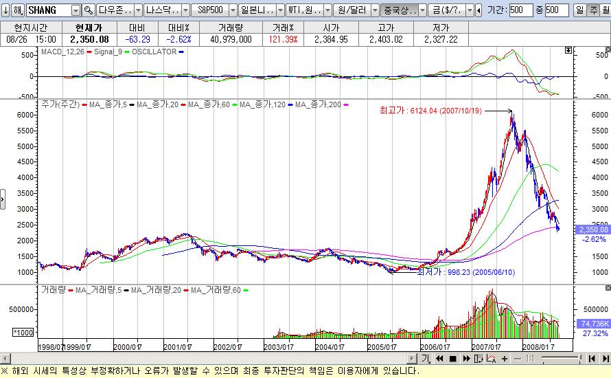 살펴보시면 중국이 2년동안 6000 포인트를 담숨에 찍고 바로 급락했습니다. 2350으로 반동강에서 한참 더 났습니다. 미국이 20~25% 급락할 때 중국은 60%가 급락한 것입니다. 지난 2년간 중국도 적립식 펀드와 주식 붐이라 서민의 타격이 엄청났을 겁니다. ㅠㅠ