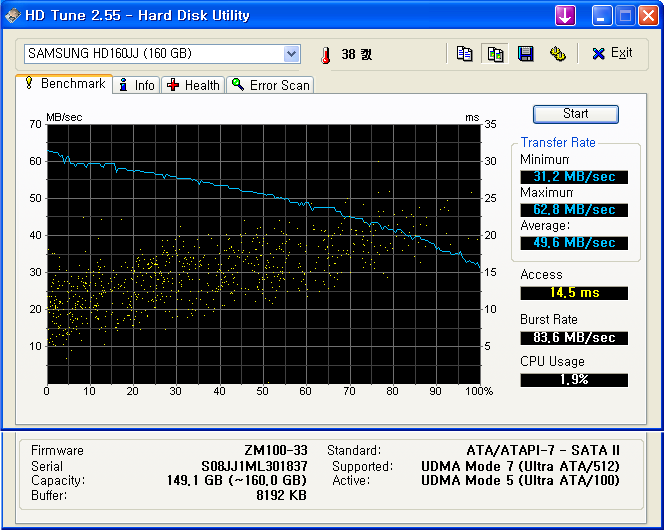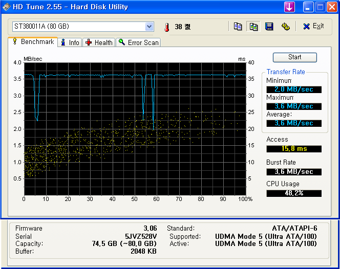 그래서 가만히 생각해보니, 하드디스크간 전송속도가 (Total Commander를 사용하는데, 복사나 이동시 속도가 나오지요 ^^) 4자리가 나오는겁니다.. 3xxx kbtes/s 이런식으루요. 분명 옛날엔 다섯자린건 같았는데.. 아니면 회사만 그랬던가.. 하면서 HDTune을 돌려봤습니다.