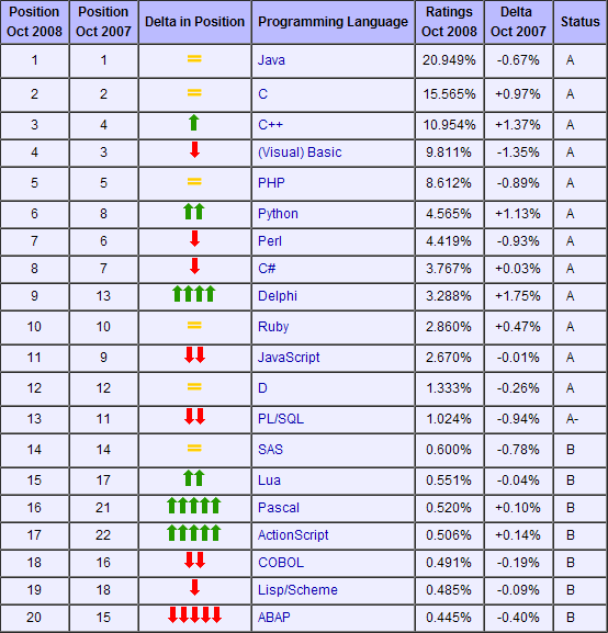 2008년 10월 기준의 TIOBE 프로그래밍 언어 순위가 나왔습니다. 이 TIOBE 순위는 아주 공신력있는 조사를 거친 것은 아니지만, 각 언론 보도 등에서 자주 인용되고 가장 신뢰받는 지수이므로 충분히 큰 의미가 있습니다.