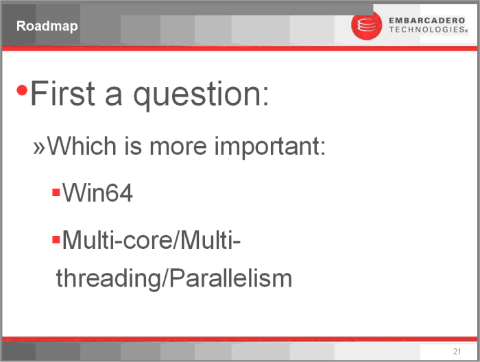 코드기어에서 아마도 이 두가지 가능, 즉 64비트 지원과 멀티코어/멀티쓰레딩 지원 중에서 어느 것을 먼저 구현할 지를 저울질하고 있는 것 같습니다. 제가 수집한 전세계의 이번 2009 버전 발표회 세션들의 자료를 보면 공통적으로 참석자들에게 이 둘중에 어느 것이 더 중요한지 설문하는 부분이 있었습니다.