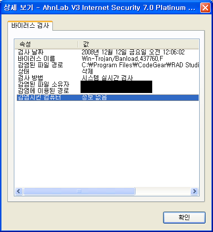 방금 당신을 Win-Trojan/Banload.437760.F 바이러스를 만들어서 컴파일했습니다. (당신은 해커... 아니 크래커...)