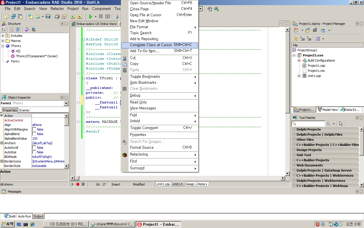 implementation 절에 class의 함수형내가 자동으로 만들어 줍니다. c++로 보면 Header에 class선언한후에 자동완성키(메뉴)누르면 cpp에 함수형태를 자동으로 만들어 주는 기능을 말하는것 같습니다. CBuilder6의 ClassExplore에서 class선택하고 NewMethod 메뉴를 통해 header와 cpp에 자동으로 함수형태를 만들어 주는 기능이 있는데.. delphi에서는 직접 타이핑으로 type절에 class선언및 함수를 선언하고도 자동완성키 입력하면 implementation 함수겁데기 주루룩 만들어 줍니다. type절에 class가 여러개이면, 알아서 class별로 구역을 나눠 구분해서.. 시간이 되면 함 ToolAPI로 CBuilder에 기능을 함 만들어 넣고 싶은데... ToolAPI도 잘 모르고.... 관련 글 리스트