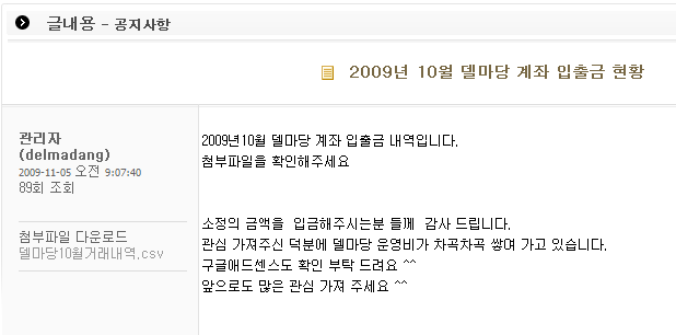 델마당 공지를 보면 입출금 내역을 1달마다 공개하는데