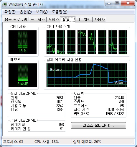 어쨋든... 메모리를 계속 할당 해서 RAM 이 모자라면 PageFile 로 오래된 메모리들을 계속 스왑 합니다(물론 페이지 폴트 뜸 복원하지만)그런데 Free 해서 메모리가 비었다 해도, 쓰지도 않을 메모리를 스왑하기 위해 하드를 긁을 이유가 없으니 계속 PageFile 에 남아 있는거죠. 결과적으로 RAM 엔 좀 더 여유가 생기는거고.. 예전에 인터넷에 떠돌아다니던 무슨 메모리 최적화 프로그램이 사용했던 방법인데...(무작정 할당하고 몽땅 다 Free하기) 무식한방법이죠 =_=; 메모리에 예민한 프로그램들은 최적화 실행시키면 기냥 할당에러 뱉고 죽어버리는 관련 글 리스트