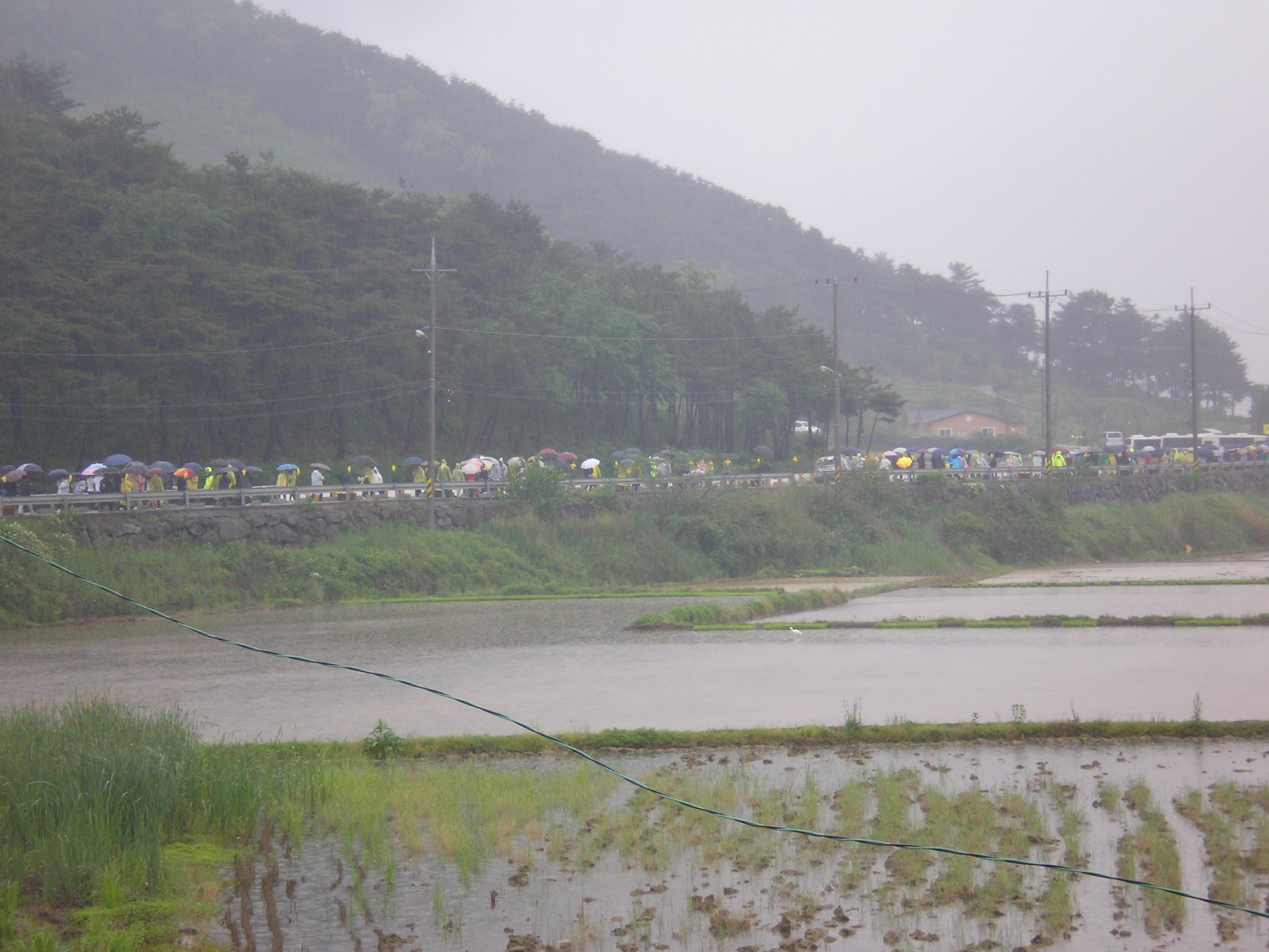 사람들이 너무 많이 와서 봉하마을에서 한참 떨어진 곳에서 내려서 걸어가야 했습니다.