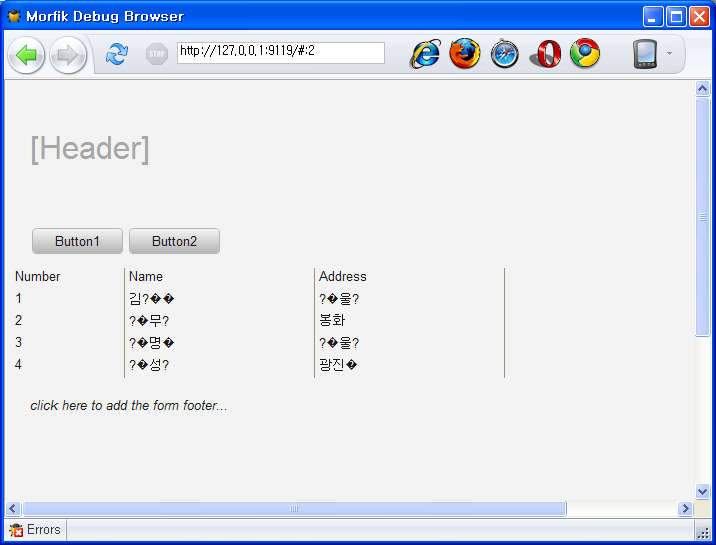 그 뒤는 깨진다는 특징을 가지고 있네요. 즉 0xE0 이상의 값을 가진 값이 나타나면 UTF8의 선두 문자로 보고 이를 화면 표시용 언어로 변환하는 과정에서의 문제라고 생각되는 군요. 즉 그리드에 표시되는 문자의 원소스가 UTF8이라는 것을 가정하고, 이를 그리드가 인식하는 화면표시용 언어로 디코딩하는 과정에서의 문제라고 생각됩니다. 그러므로 그리드 표시하는 타켓 언어만 ansi (euc-kr) 등으로만 지정해 줄수 있으면 될것 같은데 이 부분은 보통 브라우저가 역할을 맡기도 하므로, 브라우저가 알수 있도록 그 부분 디코딩언어를 지정해 주는 것도 생각해 볼수 있습니다. 몰픽이 나름대로 성능이 어느 정도 나오고 충분한 확장성만 가진다면 IW에 실망했던 개발자의 시선을 잡을수 있을 것 같군요. 몇 시간 본 바로는 충분히 매력적이라고 판단하기는 어렵고요. 이전에 모픽으로 몇 가지 만들었습니다.