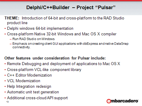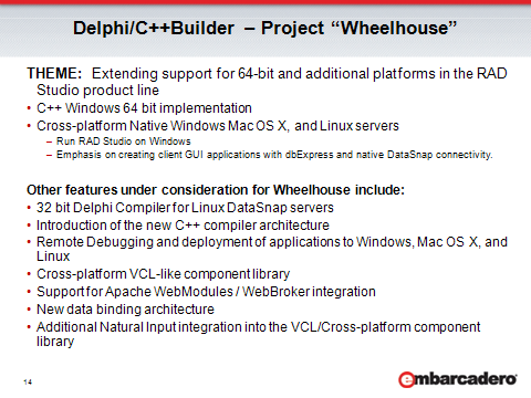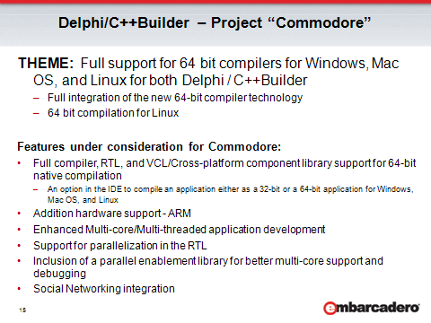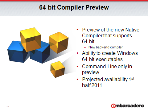 C++빌더와 델파이의 64비트 지원 계획에 대해서는, 현재로서는 작년 8월말에 엠바카데로에서 나온 로드맵이 마지막 소식입니다.