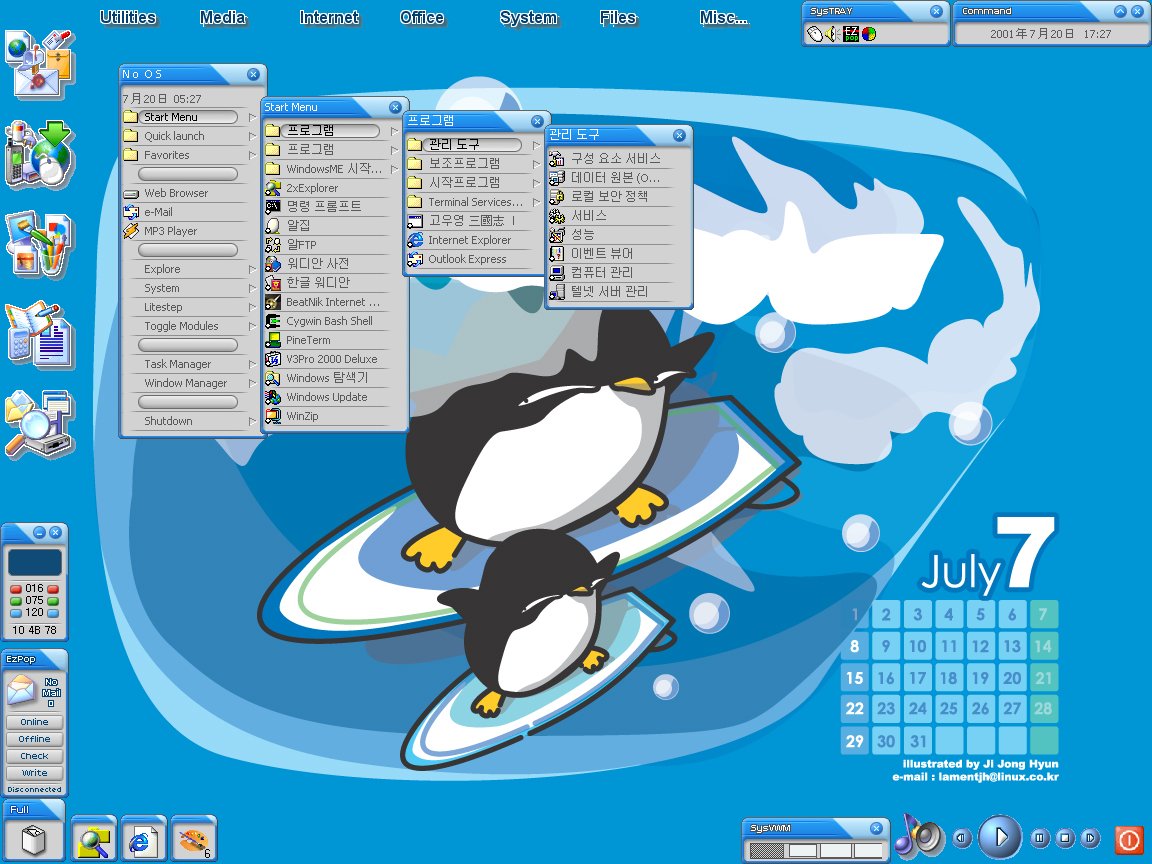 성질 급하신 분은 내 노트북의 스크린샷을 보시면 되겠다. 일단 바탕화면의 너절한 아이콘들이 없어진다. 그리고 오른쪽엔 이상한 이름 (Danny's UltraStep!)의 메뉴창이 떠있고 (요게 popup이다), 왼쪽엔 또 기괴한 모양의 막대기가 있는데 누르면 해당하는 프로그램이 실행된다 (요게 wharf다). 그나마 보는 사람을 안도하게 하는건 아래쪽에 있는 작업표시줄인데 (요건 taskbar 맞다), 가만히 보니 시스템트레이가 왼쪽에 가 있고 [시작] 버튼이 없다. 또 눈썰미 있는 분은 오른쪽 위의 네모난 상자가 괜히 멋으로 있지는 않을거라는 걸 눈치채셨을 거다 (요건 lsxcommand 다). 사실 맘만 먹으면 eFX 등을 써서 창의 모양까지 싸그리 바꿔버릴 수도 있겠지만 나의 경우는 내 시스템이 불안정해지는 관계로 쓰지 않는다 (전혀 문제가 없는 분들도 많으니 여러분은 한번 시도해 보시라).
