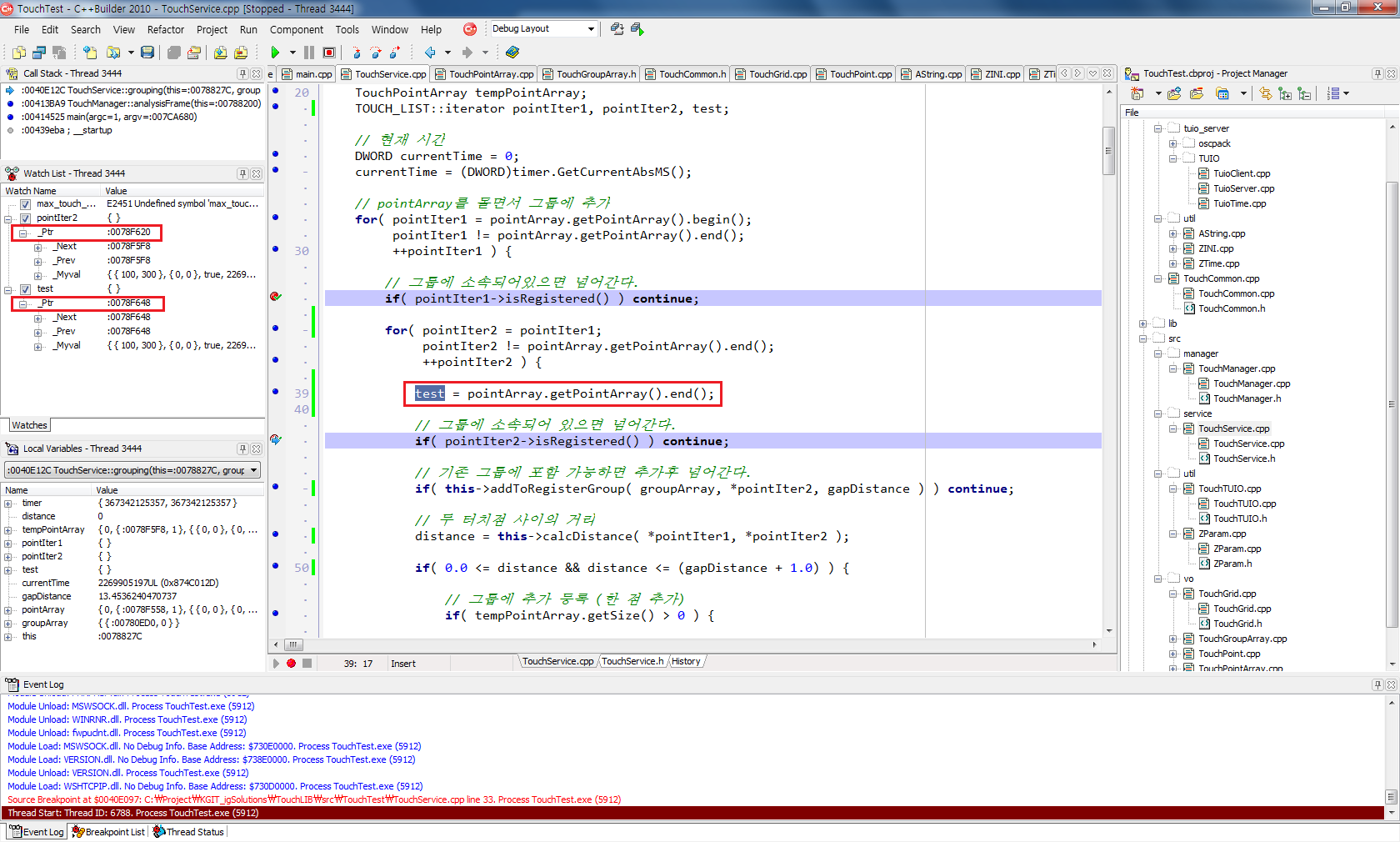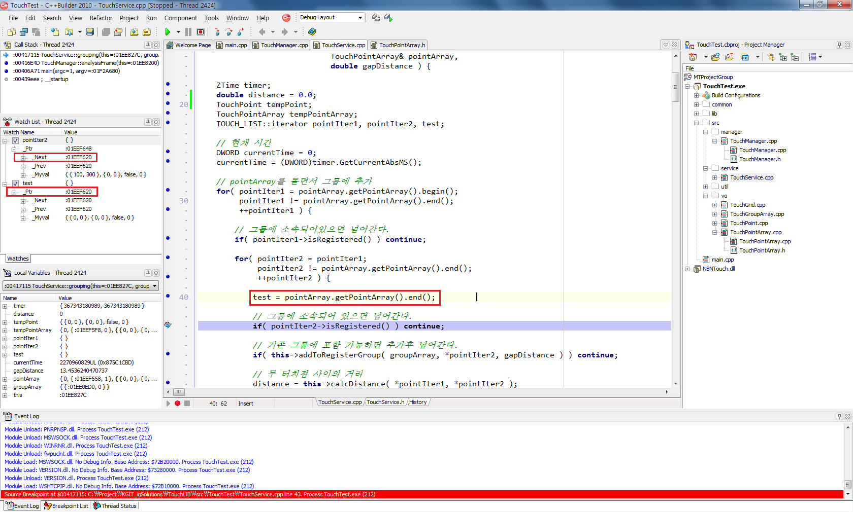 2011년 오늘... 멀티터치 코드를 라이브러리로 열심히 정리하고 이제 실행하면서 코드 테스트 중에 이상동작 발생!