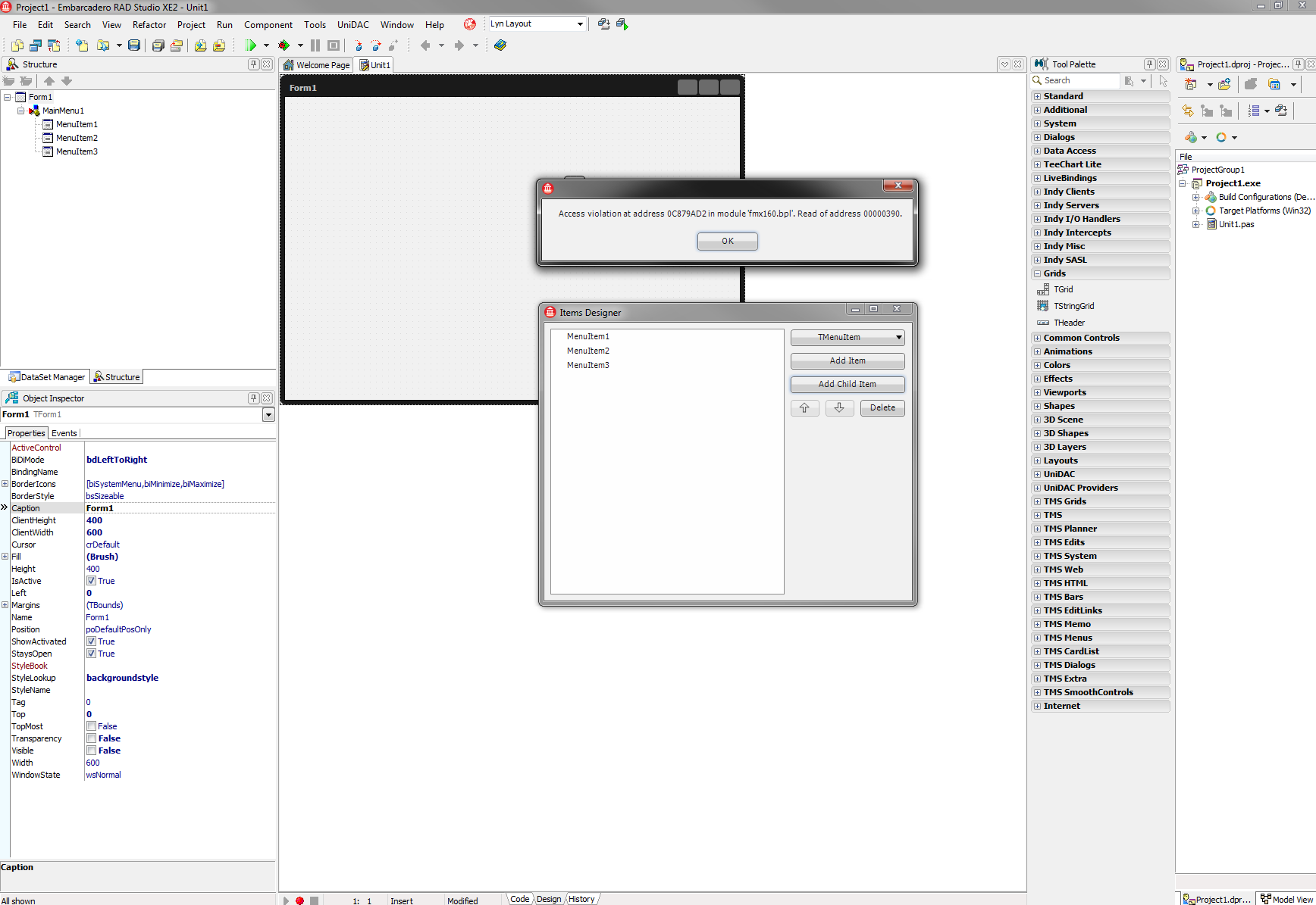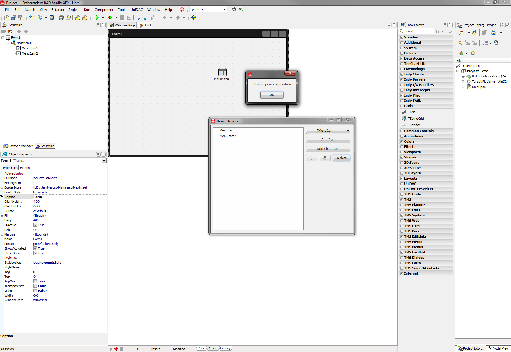 빈폼에 메인메뉴 올리고, 아이템 에디터에서 AddItem -> Add Child Item -> Delete 순으로 누르면 오퍼레이션 에러 발생