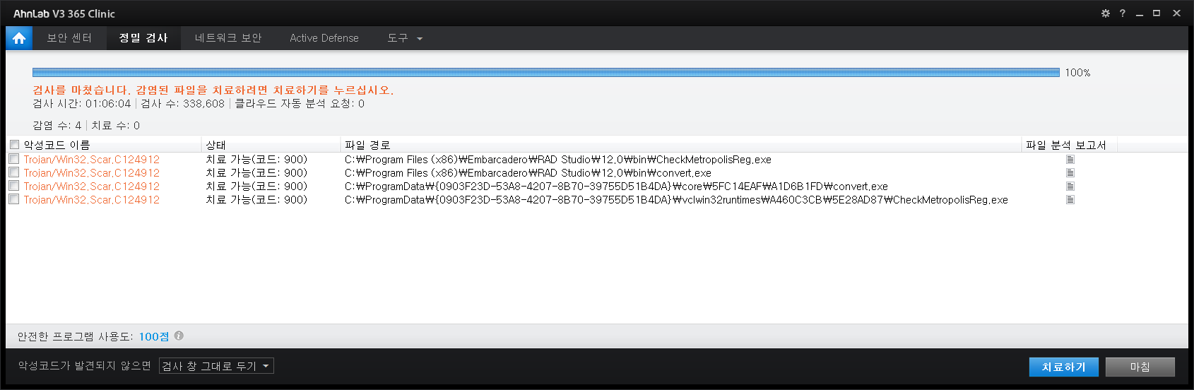 어쩔수 없이 정밀 검사가 끝나기를 기다려 Trojan/Win32.Scar.C124912 검사 예외에 추가 했습니다.