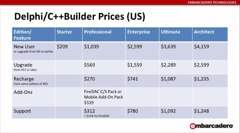 델파이, C++빌더 단품 기준으로 프로페셔널 999달러에서 1039달러로, 엔터프라이즈는 1999달러에서 2599달러로.