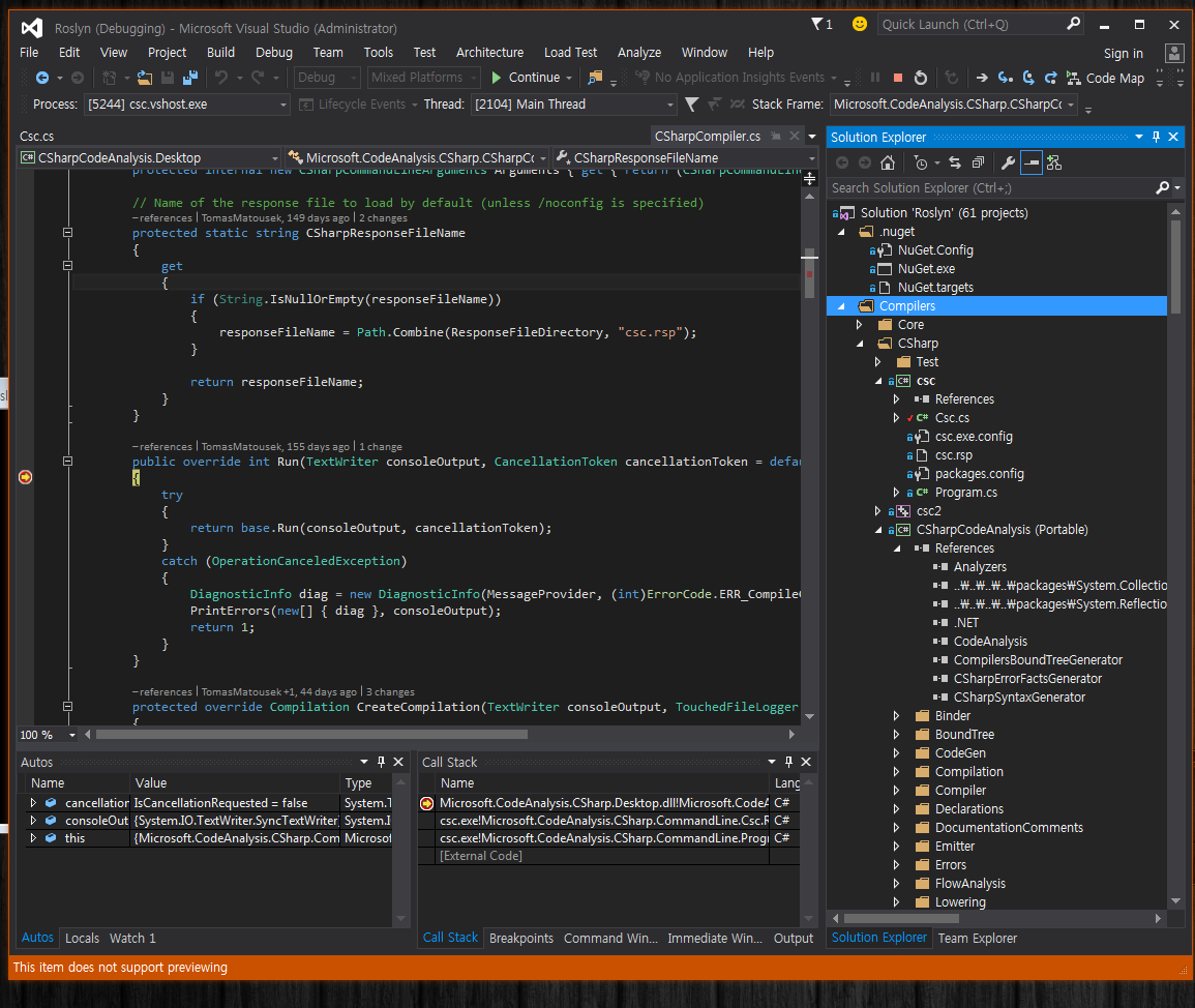 아닐까 싶다. Visual Studio IDE에서 Team Explorer를 이용해서 git repository 서버와 바로 연동이 되고 Roslyn 소스코드를 원하는