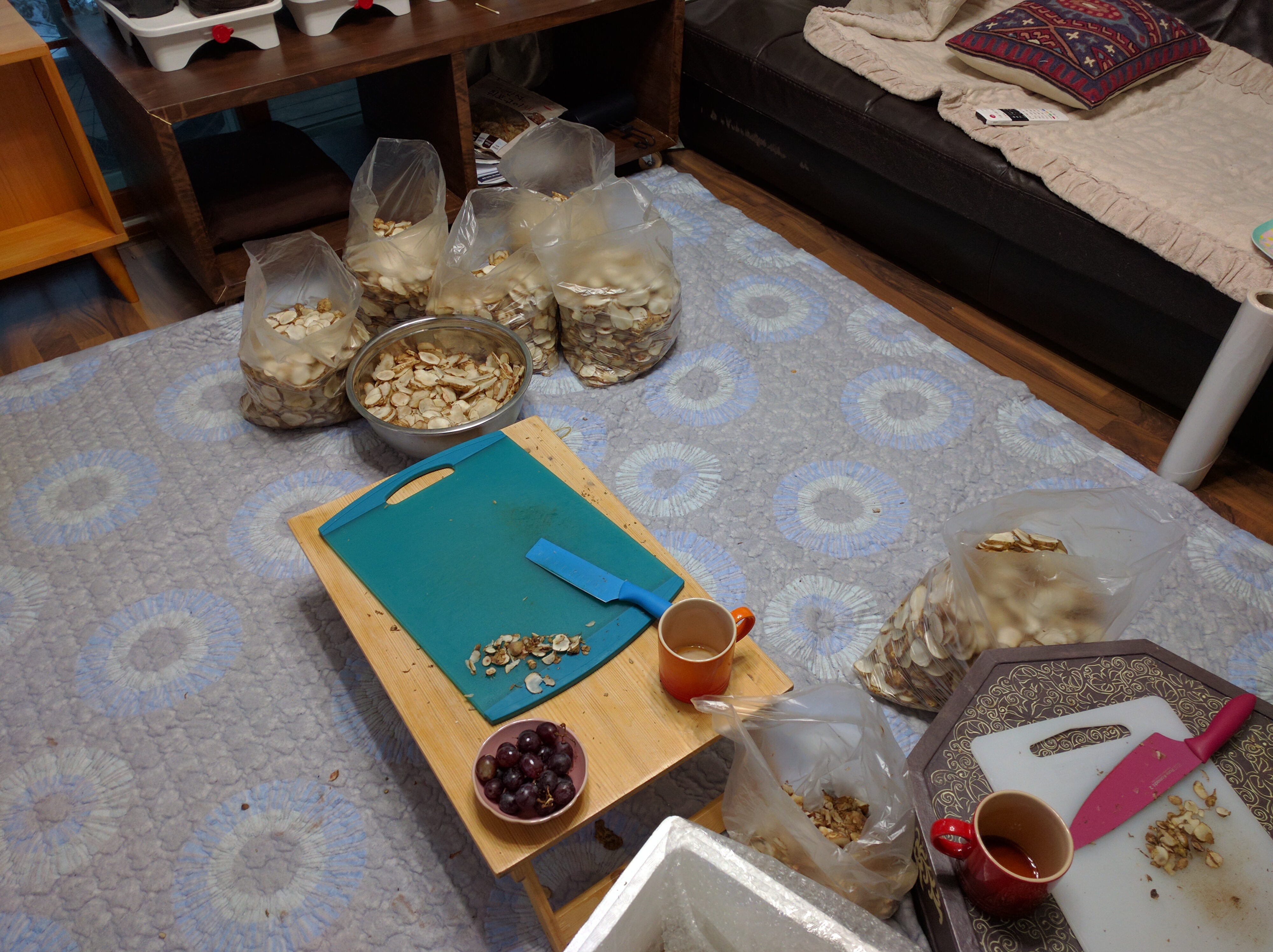 돼지감자차로 완성하려면 이 슬라이스를 말린 후에 볶아야 하는데, 일단 이걸 말리는 게 큰일입니다. 햇볕이 가장 약해진 겨울 아닙니까. 말리려고 널어놓으면 아마 한달 넘게 걸릴 거고, 관리도 어려울 거고. 식품건조기를 쓰자니 어마어마한 양이라 전기료 폭탄을 맞을 거고. (건축 공사 문제 때문에 몇달동안 태양광 발전을 못하는 상황입니다)