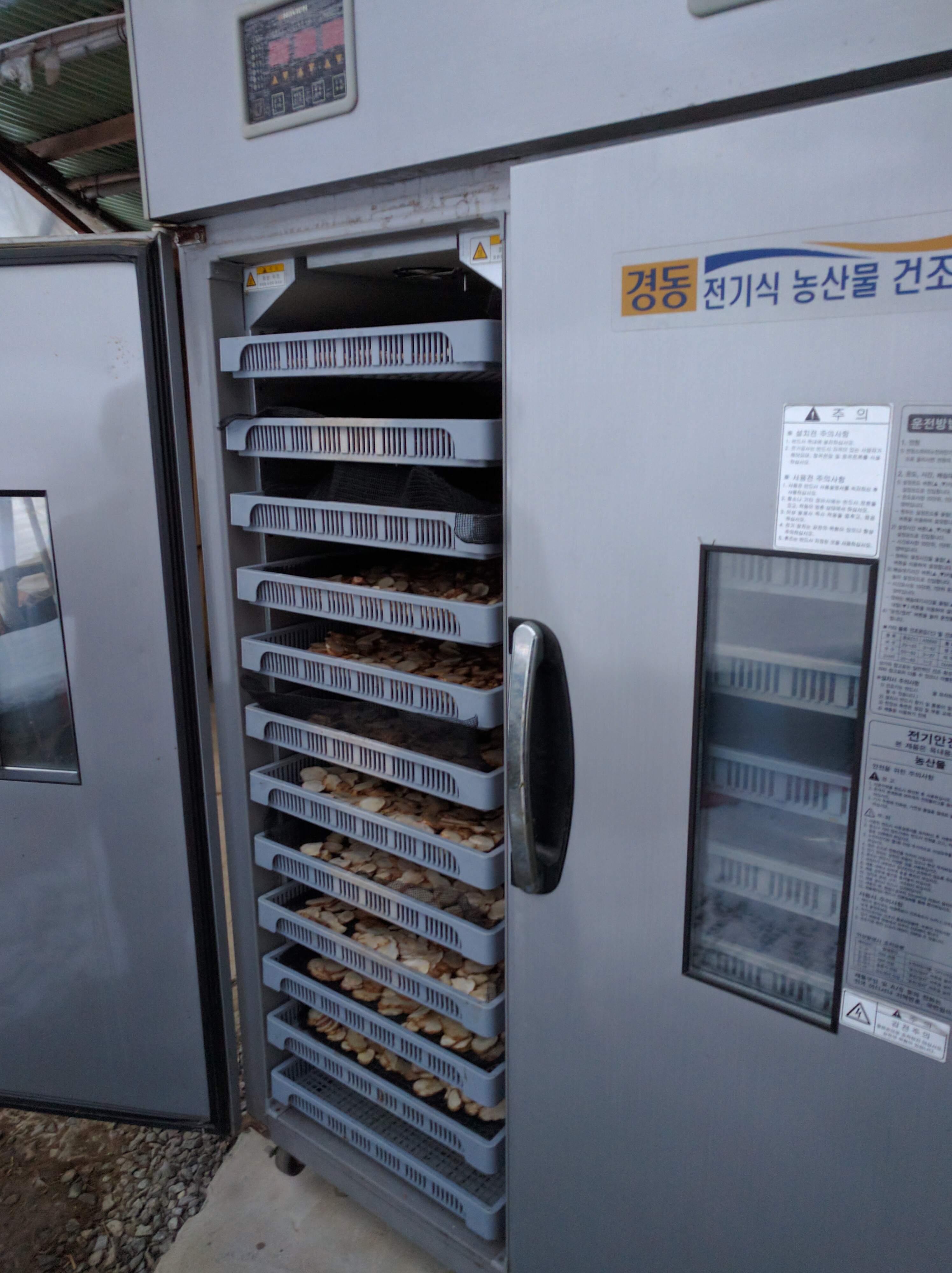 몇시간을 데굴대며 고민했는데, 이런 미련한 녀석. 여기가 농촌이라는 걸 깜빡 잊고 있었던 거죠. 농가에는 사진에 보이는 이런 건조기 하나쯤은 다 있습니다. 가정용 냉장고 두개를 붙여놓은 정도의 장비인데, 제 어마어마한 돼지감자 슬라이스를 다 넣어도 반밖에 안차더군요. 농사용 장비이기 때문에 당연히 농사용 전기를 쓰고, 그래서 전기료 부담도 거의 없습니다.