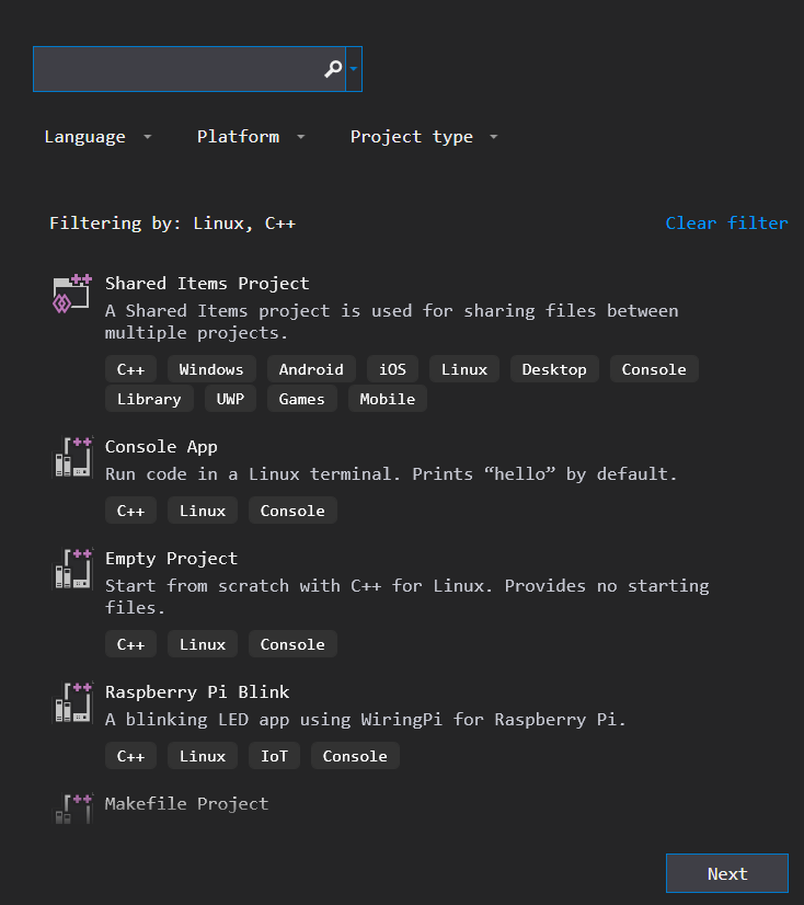 프로젝트 매니저에 C++ Linux target platform이 나올리가 없죠. 지원되는 C++ 컴파일러 자체가 없으니...