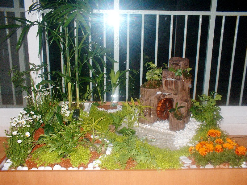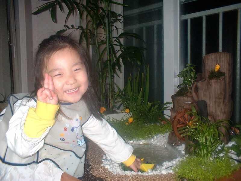 이동식 미니 정원 속 미니호수에 종이 배를 띄우며 즐거워하는 현지
