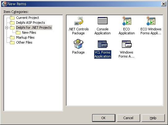 VCL.NET 폼을 만들기 위해서는 New Items 다이얼로그에서 찾아가야 합니다