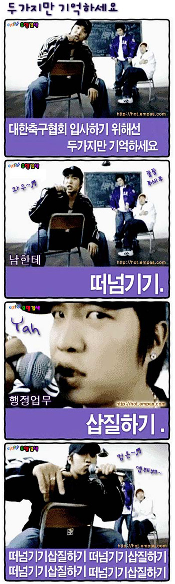 이번에 등장한 작품은 패러디 단골메뉴로 등장하는 '북치기, 박치기' 스토리보드를 배경으로 이번 대한축구협회가 국가대표 선정조차 깔끔하게 마무리짓지 못할 정도로 부족한 능력을 드러내 구설수에 오른 점을 꼬집었다.