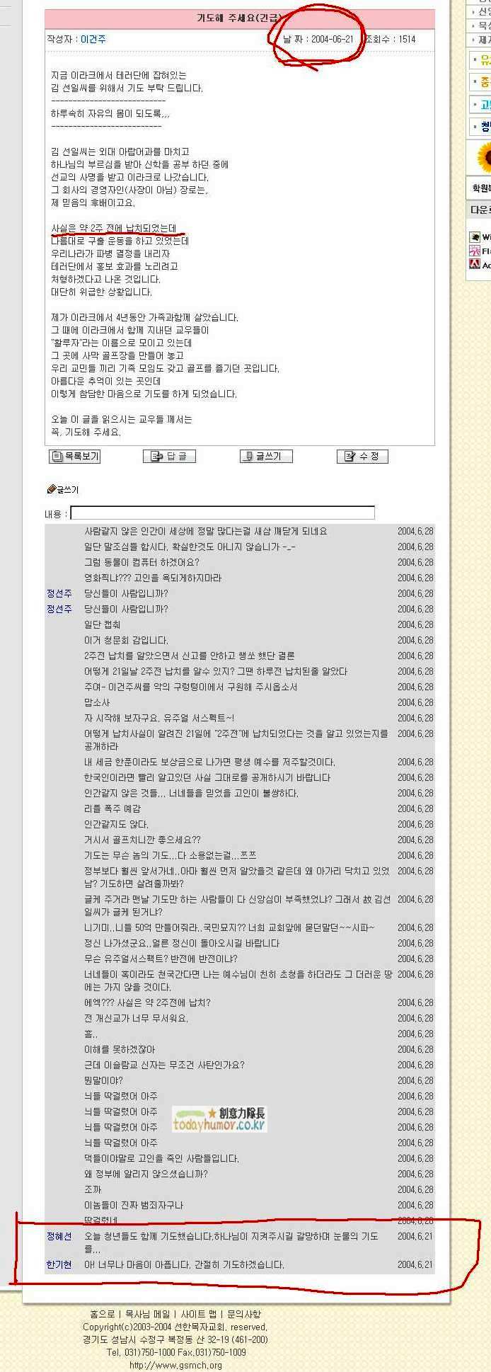 황당한 것은 이 교회에서 미리 알고 있었다는 것 뿐만이 아니라, 김선일씨가 선교사로서 이라크에 파견되었다고 써있다는 겁니다. 미군 군납업체 직원에다 선교사... 바그다드 현지 교회에서 목회 활동까지 했었다니, 이건 뭐 숫제 휘발유 덮어쓰고 불난집에 뛰어든 꼴 아닙니까.