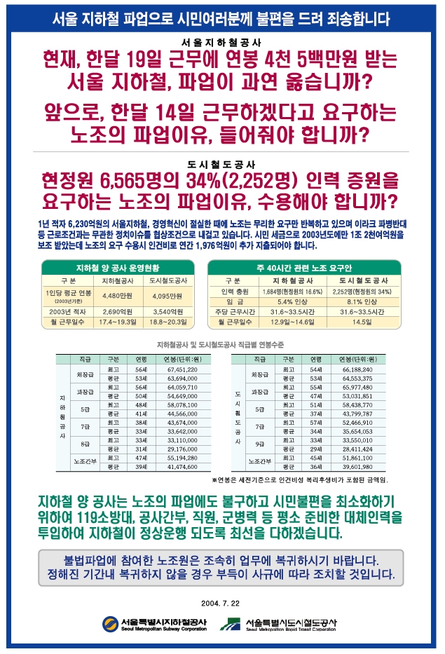어찌 시민이 주는 월급을 받으면서 시민의 발을 담보로 파업을 할수 있습니까?