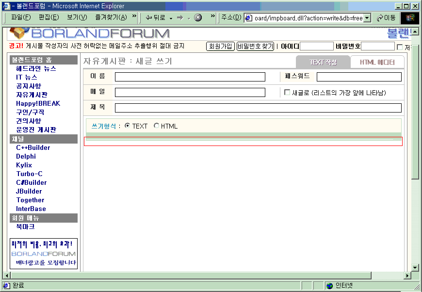 캡쳐 파일의 빨간색 부분이 글 쓰는 텍스트 박스 입니다.